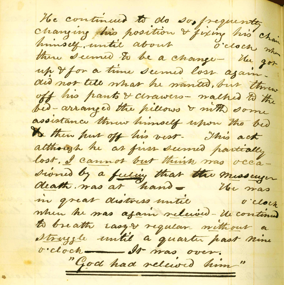 In 2013, three more of Josiah’s diaries were added to the Library in two separate acquisitions. Two volumes of earlier writings (1848-1860) came into the possession of a Greenfield book dealer through an individual living in western New York. Not being immersed in the history of the Allens, the book dealer came to the Library to determine just who this Josiah Allen of Deerfield was. These ‘new’ diaries preceded those that we owned, and I immediately offered to purchase them. Just weeks later, yet another Josiah Allen diary came on the market. The seller in Sacramento, California, offered them in an ebay auction. At the end of the bidding we owned all of Josiah Allen’s diaries. The last was actually the first in terms of dates, and had been begun in 1838 by Josiah’s father, Eliel Allen (1775-1844). Eliel’s diary entries are terse, one-line observations on weather, church services, and farm matters. The last occurred on Wednesday, November 6, 1844. Josiah began keeping the diary the next day. Six days later he recorded his father’s death: “He continued to breath [sic] easy & regular without a struggle until a quarter past nine o’clock. — It was over.”